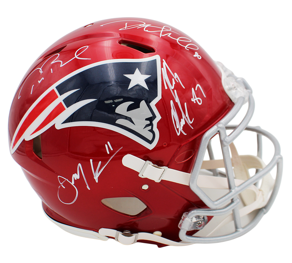 A New England Patriots Speed Speed Authentic Flash NFL Helmet hand signed by Julian Edelman, Rob Gronkowski,Tom Brady & Danny Amendola. The item and signature are in excellent condition. Julian is a wide receiver and punt returner for the New England Patriots. He played college football at Kent State and the College of San Mateo as a quarterback. He was drafted by the Patriots in the seventh round of the 2009 NFL Draft. Rob is a 5x All-Pro First Team, 5x Pro Bowler, and 2x Super Bowl Champion. AUTHENTICATION: The item is accompanied by a JSA Serial Numbered and Databased Hologram *** Radtke Sports uses professional lighting for our product images that may show reflections. ***
