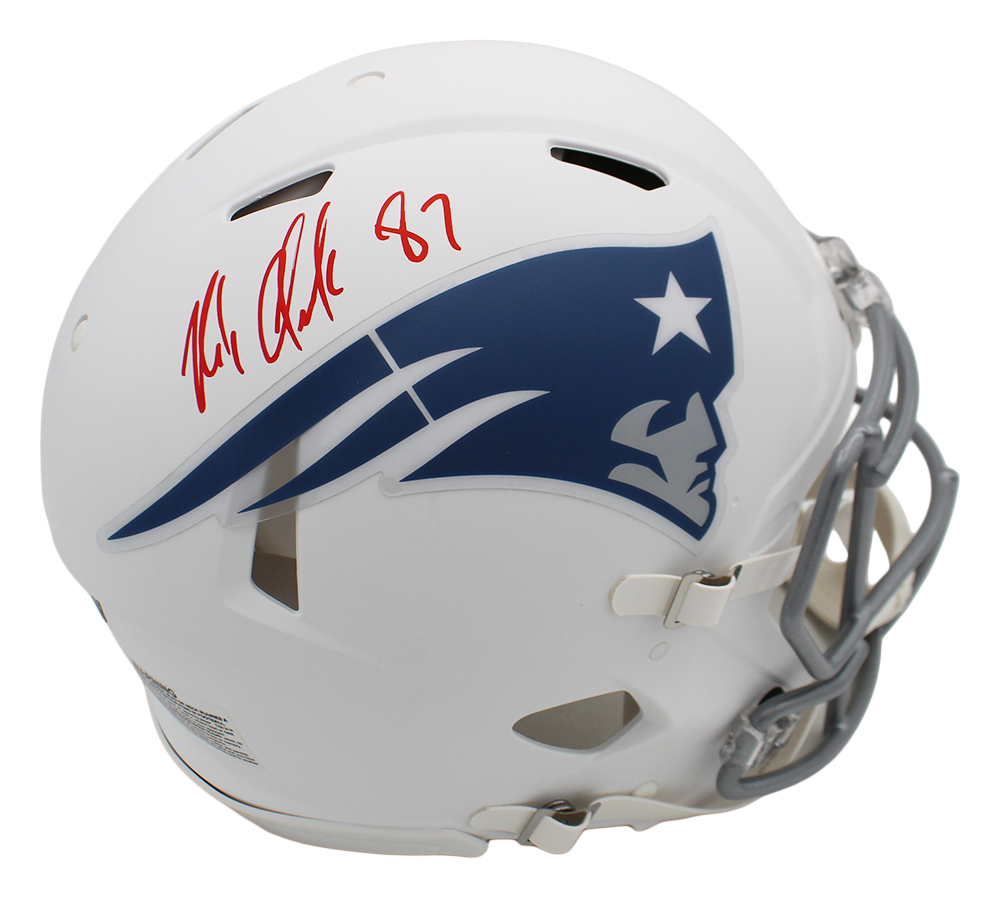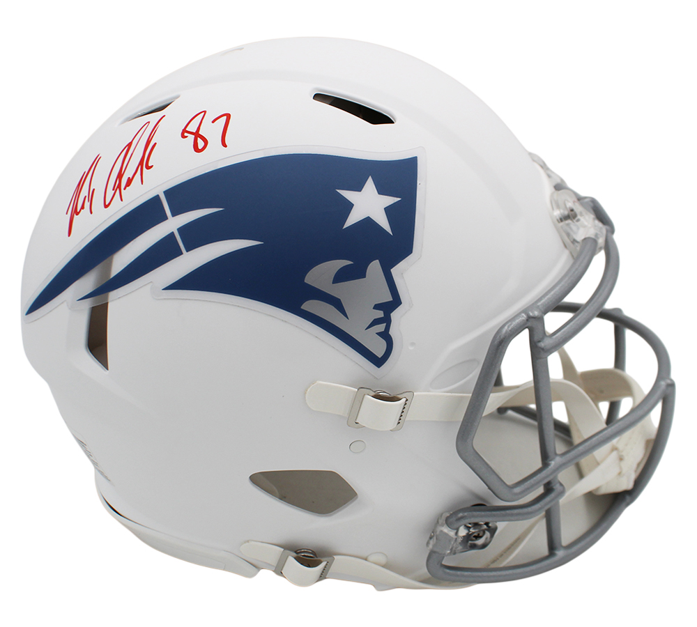 A New England Patriots Speed Authentic Rivalries NFL Helmet hand signed by Rob Gronkowski. The item and signature are in excellent condition. Rob is a 5x All-Pro First Team, 5x Pro Bowler, and 2x Super Bowl Champion. AUTHENTICATION: Your item is tagged with a Rob Gronkowski exclusive Radtke Sports SmarTag powered by Prova Technology, which gives you digital access to your items authentication records, which includes a proof picture from the signing. *** Radtke Sports uses professional lighting for our product images that may show reflections. We also feature watermarks on our proof pictures. The picture you see in your authentication records will NOT have a watermark. ***
