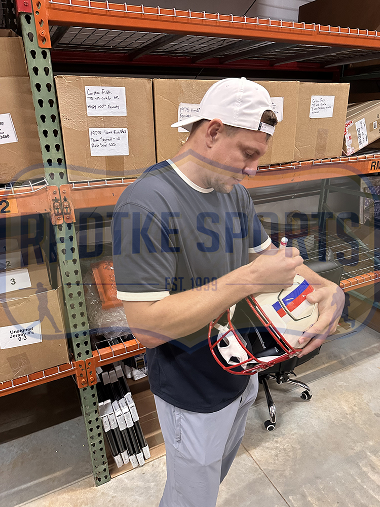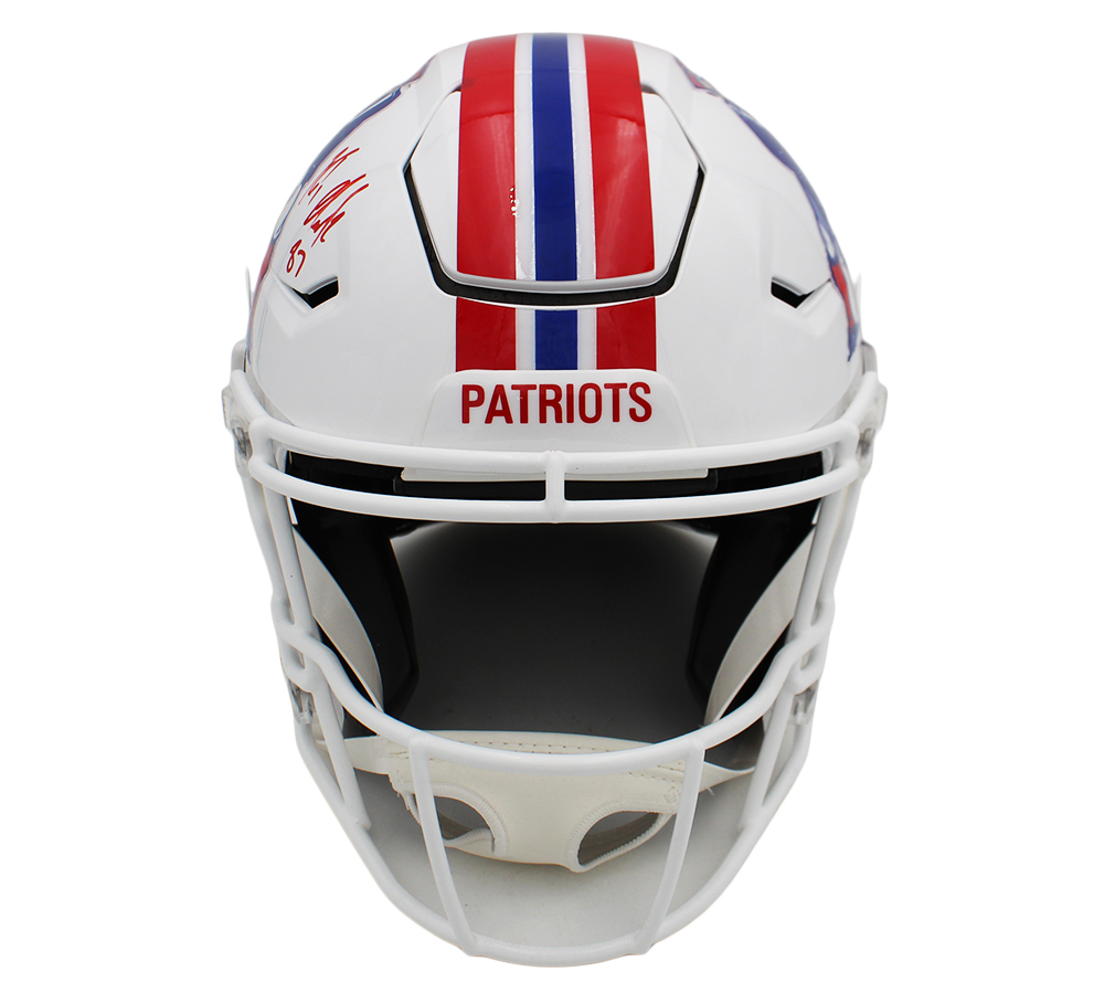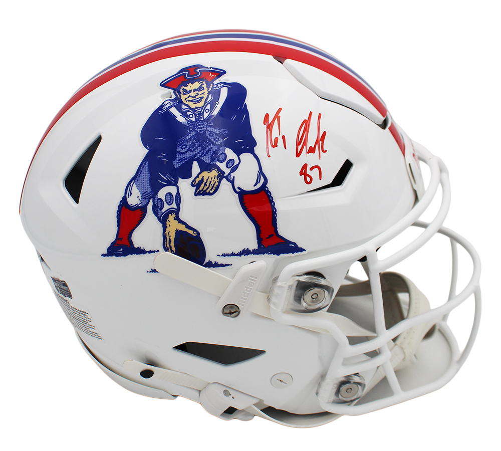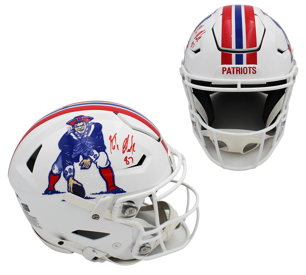 A New England Patriots Speed Flex Authentic Throwback Minuteman NFL Helmet hand signed by Rob Gronkowski. The item and signature are in excellent condition. Rob is a 5x All-Pro First Team, 5x Pro Bowler, and 2x Super Bowl Champion. AUTHENTICATION: Your item is tagged with a Rob Gronkowski exclusive Radtke Sports SmarTag powered by Prova Technology, which gives you digital access to your items authentication records, which includes a proof picture from the signing. *** Radtke Sports uses professional lighting for our product images that may show reflections. We also feature watermarks on our proof pictures. The picture you see in your authentication records will NOT have a watermark. ***