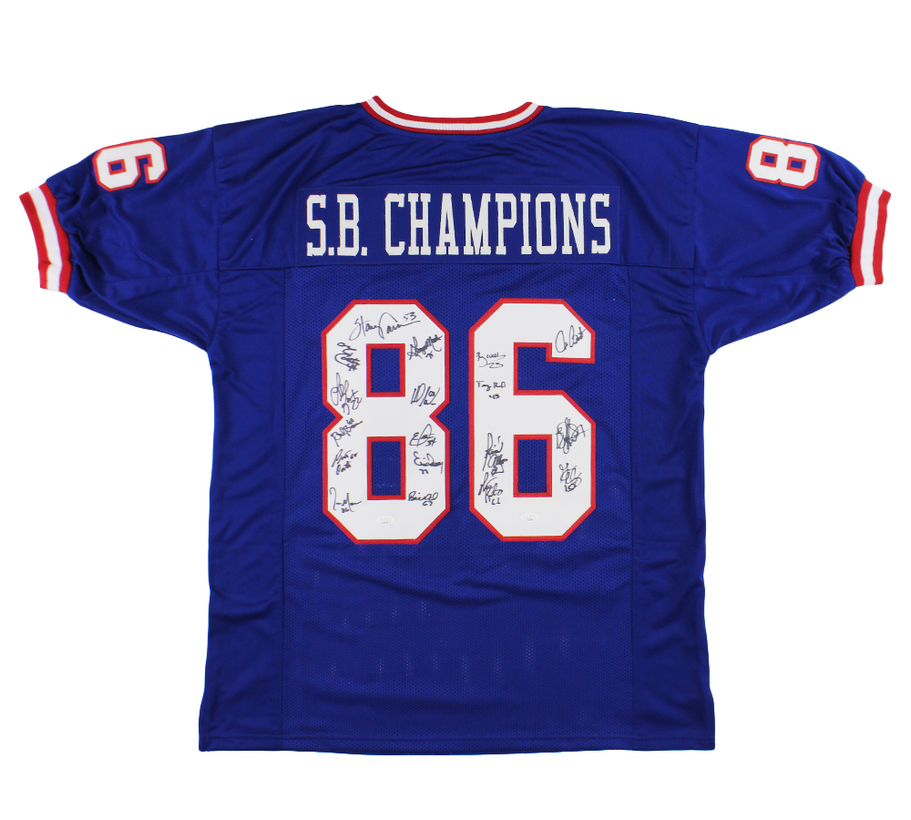 Super Bowl Champions 1986 Signed New York Custom Blue Jersey with 18 Signatures Including Maurice Carthon & Lee Kenny