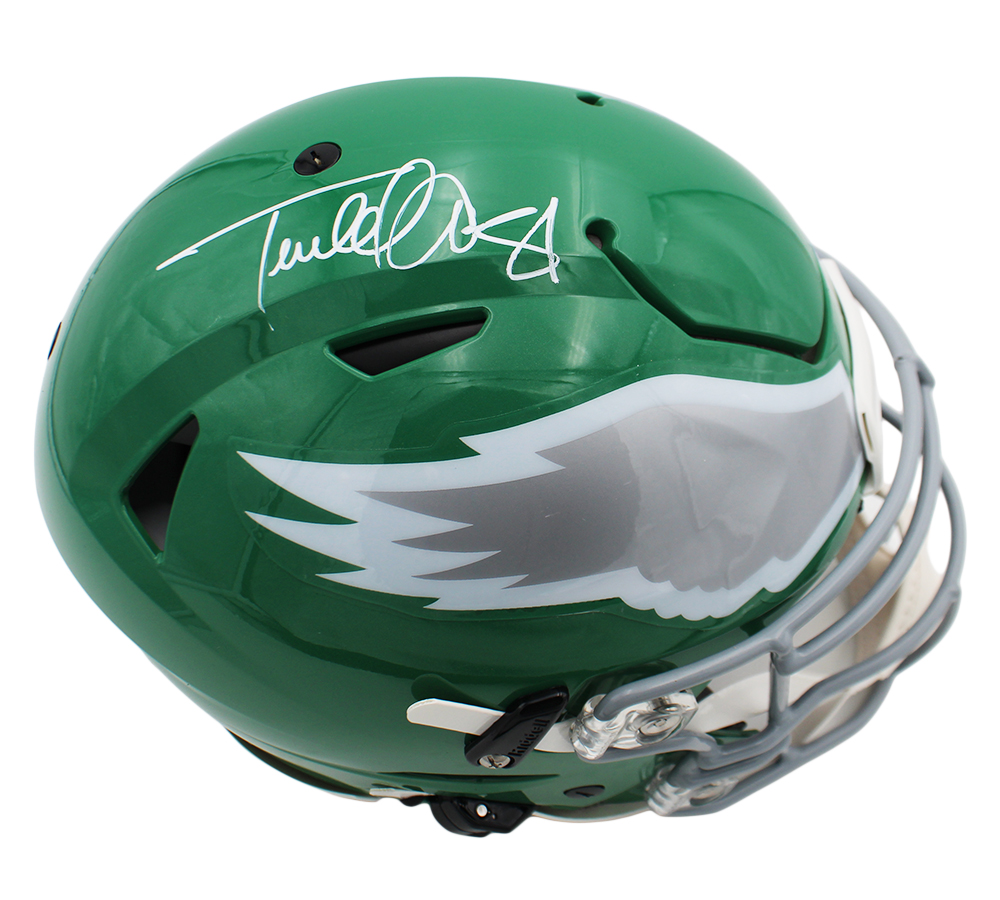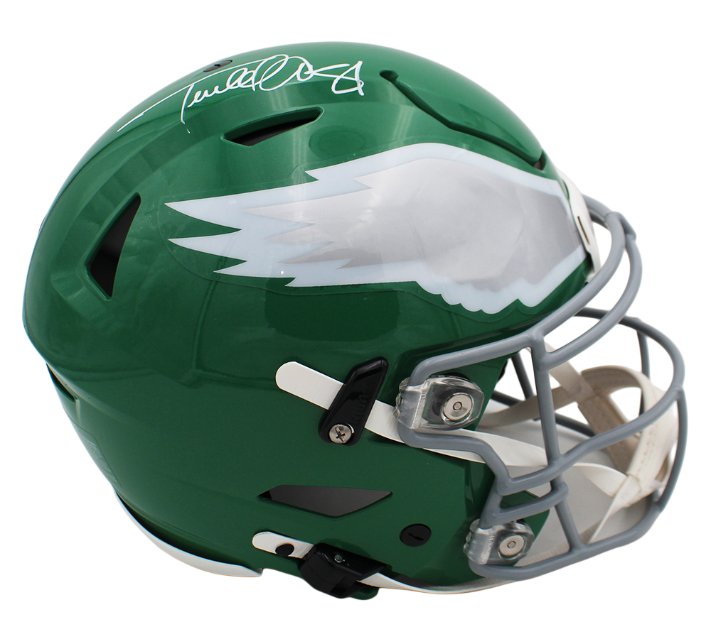 A Philadelphia Eagles Speed Flex Authentic Kelly Green NFL Helmet hand signed by Terrell Owens. The item and signature are in excellent condition. Terrell is a former football wide receiver. He is a 6x Pro Bowler and is in the San Francisco 49ers Hall of Fame. AUTHENTICATION: Your item is tagged with a Radtke Sports SmarTag powered by Prova Technology, which gives you digital access to your items authentication records, which includes a proof picture from the signing. *** Radtke Sports used professional lighting for our product images that may show reflections. We also feature watermarks on our proof pictures. The picture you see in your authentication records will NOT have a watermark. ***