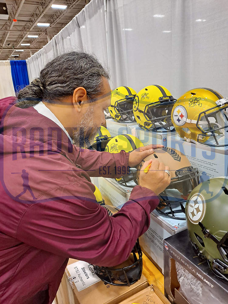 A Pittsburgh Steelers Speed Authentic Salute To Service 2 NFL Helmet hand signed by Troy Polamalu. The item and signature are in excellent condition. Troy was drafted in the 1st round of the 2003 NFL Draft by the Pittsburgh Steelers. He is a 2x Super Bowl Champ, 8x Pro Bowler & 4x First-team All Pro. AUTHENTICATION: The item has been tagged with a Radtke Sports SmarTag powered by Prova Technology, which gives you digital access to the items authentication records, including a proof picture from the signing. ***Radtke Sports uses professional lighting for their product images that may show reflections. We also feature watermarks on our proof pictures. The picture you see in the authentication record will NOT have a watermark. ***