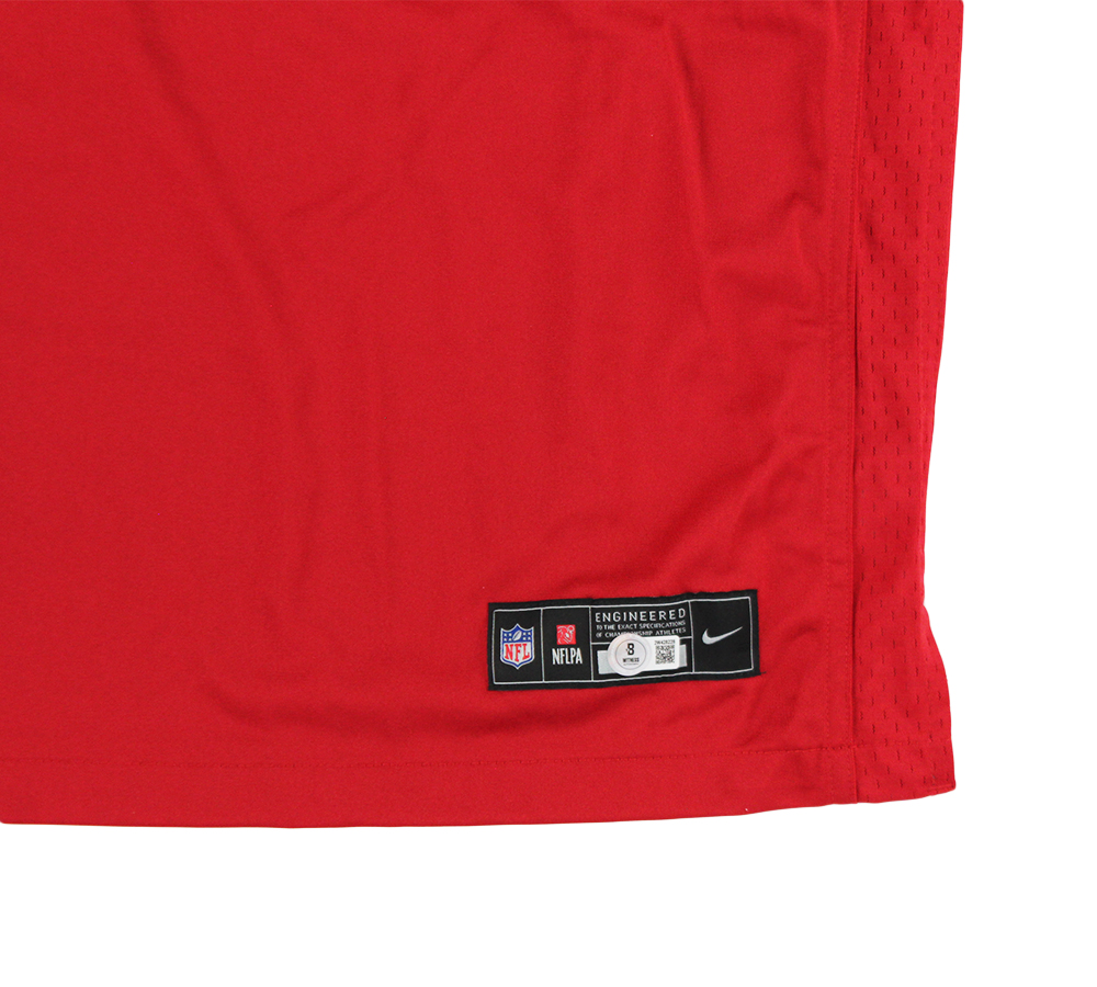 A San Francisco 49ers Nike Red NFL Jersey hand signed by George Kittle. The item and signature are in excellent condition. George is a football tight end for the San Francisco 49ers, he played college football for the University of Iowa Hawkeyes & is a 2x Pro Bowler. AUTHENTICATION: The item is accompanied by a Beckett Serial Numbered and Databased Hologram *** Radtke Sports uses professional lighting for our product images that may show reflections. ***
