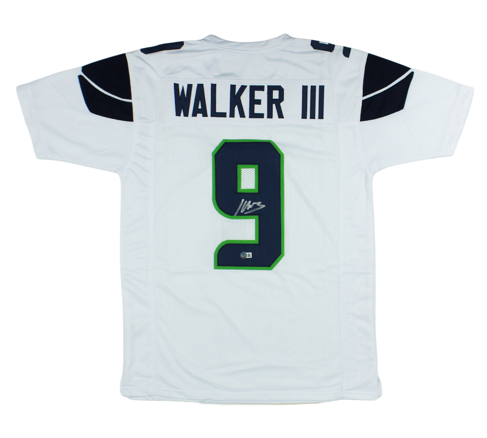 A Seattle Custom White Jersey hand signed by Kenneth Walker III. The item and signature are in excellent condition. Kenneth is a football running back. He was drafted in the 2022 NFL Draft by the Seattle Seahawks. He has received the Walter Camp and Doak Walker Awards. AUTHENTICATION: The item has been tagged with a Beckett Serial Numbered and Databased Hologram ***Radtke Sports uses professional lighting for our product images that may show reflections. ***