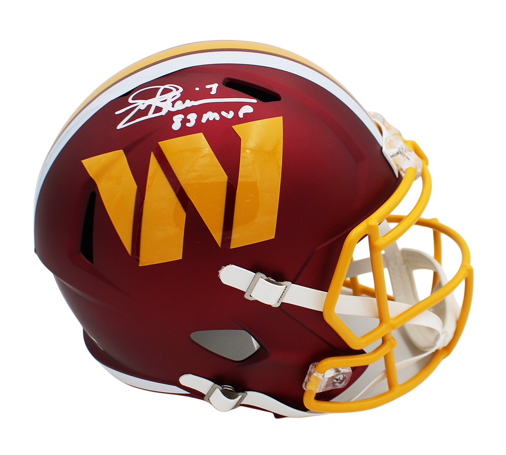 A Washington Commanders Speed Replica Alternate 25 NFL Helmet hand signed by Joe Theismann. The item and signature are in excellent condition. In addition to signing his name, Joe also inscribed “83 MVP” on the item. Joe Theismann is a former NFL Quarterback. He played 12 seasons with the Washington Commanders. He is a Super Bowl XVII Champion, 1983 NFL MVP, 2x Pro Bowler, 1983 NFL Offensive Player of the Year. AUTHENTICATION: The item is accompanied by a Beckett Serial Numbered and Databased Hologram *** Radtke Sports uses professional lighting for our product images that may show reflections. ***