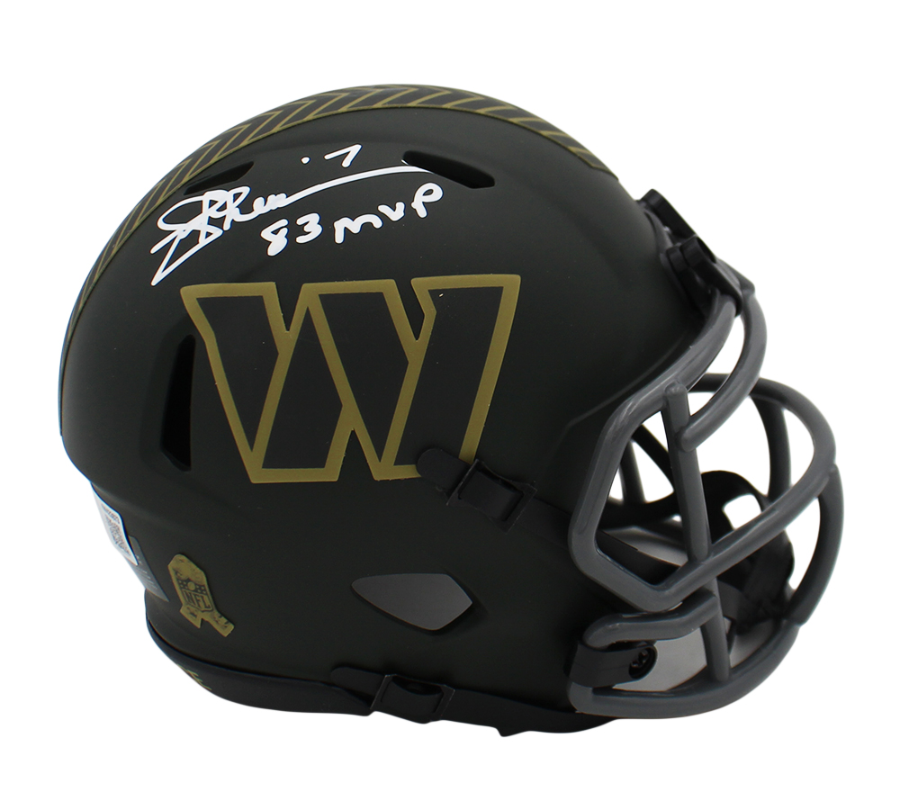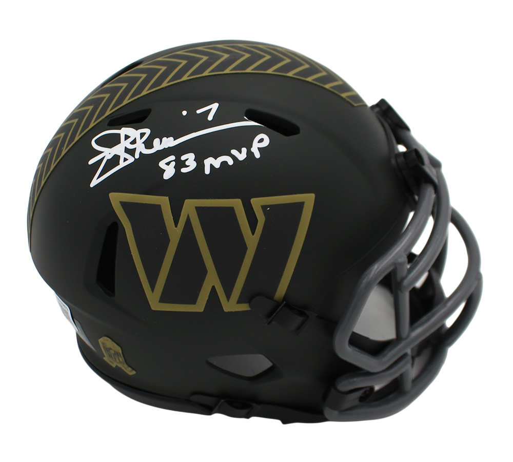 Home / Sports / NFL / Las Vegas Raiders / Mini Helmets / Joe Theismann Signed Washington Commanders Speed Salute to Service 4 NFL Mini Helmet with “83 MVP” Inscription